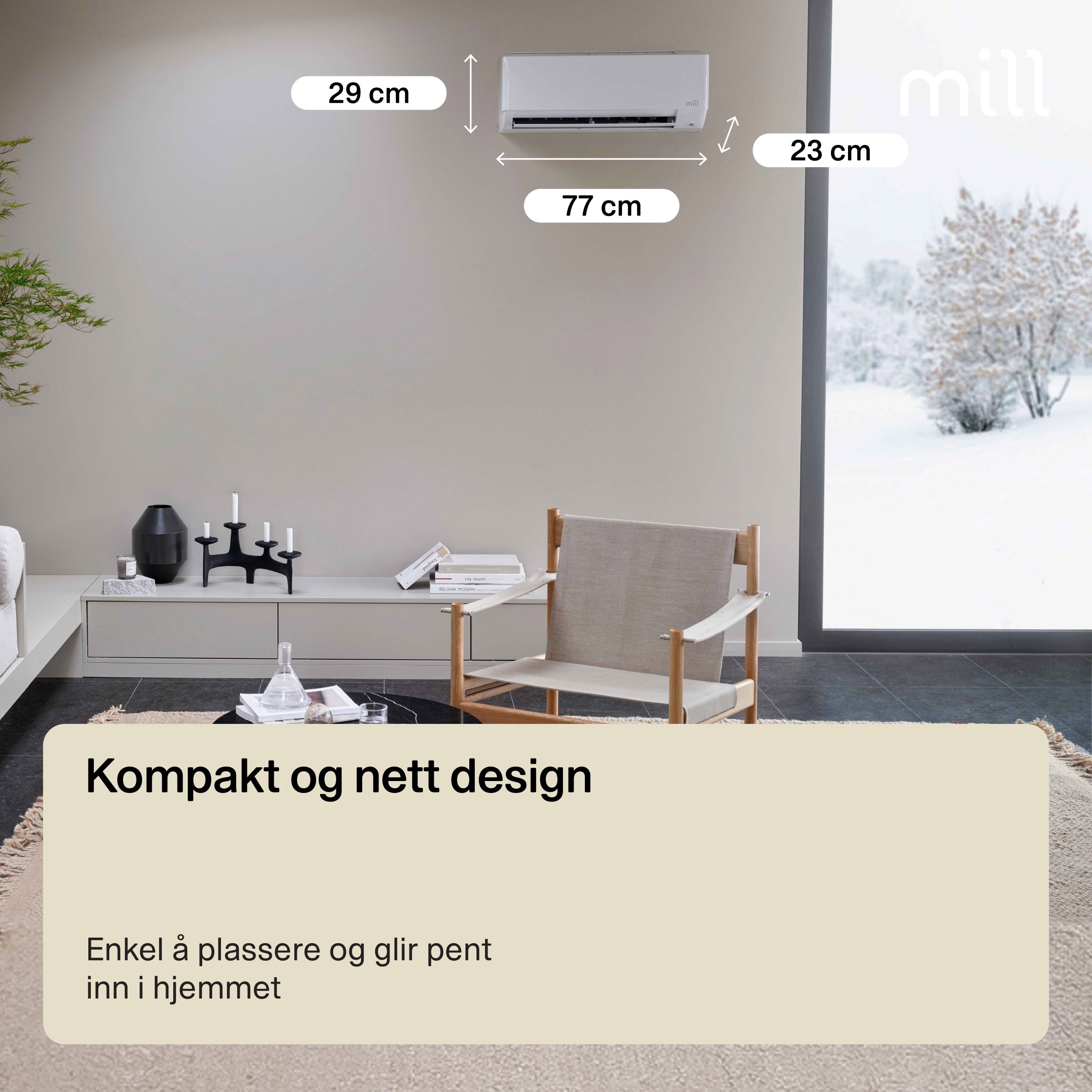Mill-appen er den samme appen som styrer Mill WiFi varmeovner, som betyr at du kan få full kontroll over oppvarmingen i hjemmet ditt i en og samme app. Med denne smarte varmepumpen gir Mill deg den ultimate skandinaviske hjemmekomforten med høy varmeeffektivitet og komfortabel kjøling tilpasset dine personlige behov. Varmepumpen er utviklet for nordiske forhold, og er effektiv også på spesielt kalde dager (fabrikktestet ned til -30°C). Denne modellen anbefales for middels store åpne romløsninger opp til 100 m².