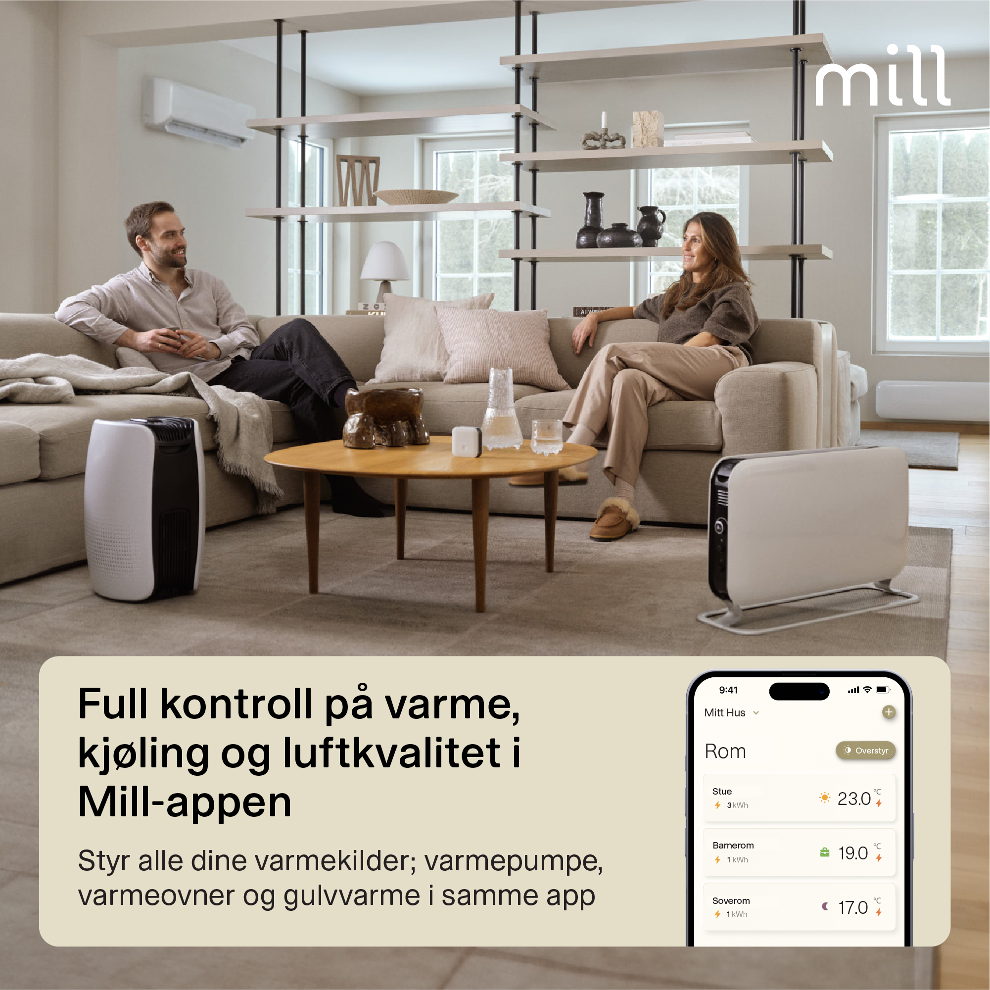 Styr oppvarming og kjøling med Mill-appen