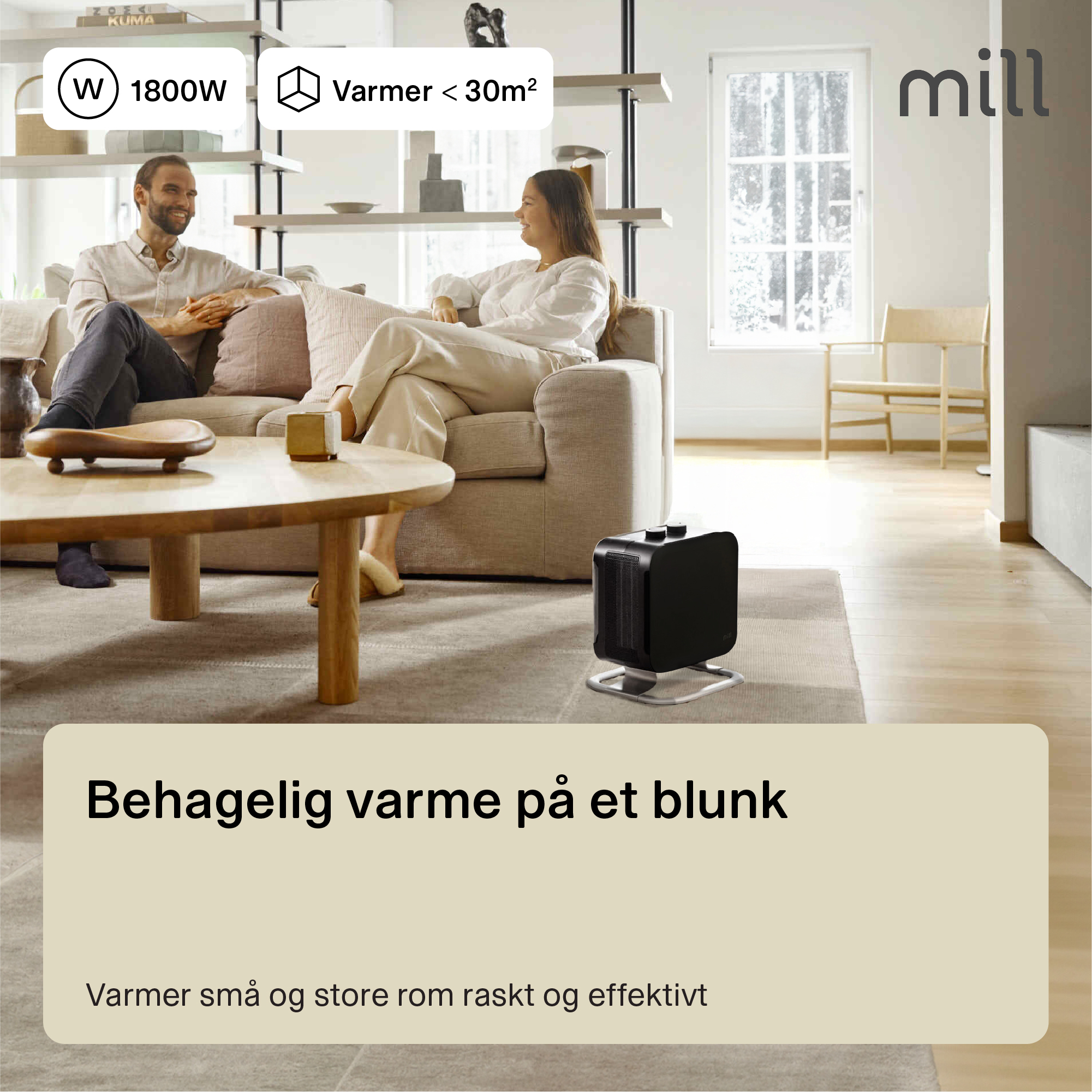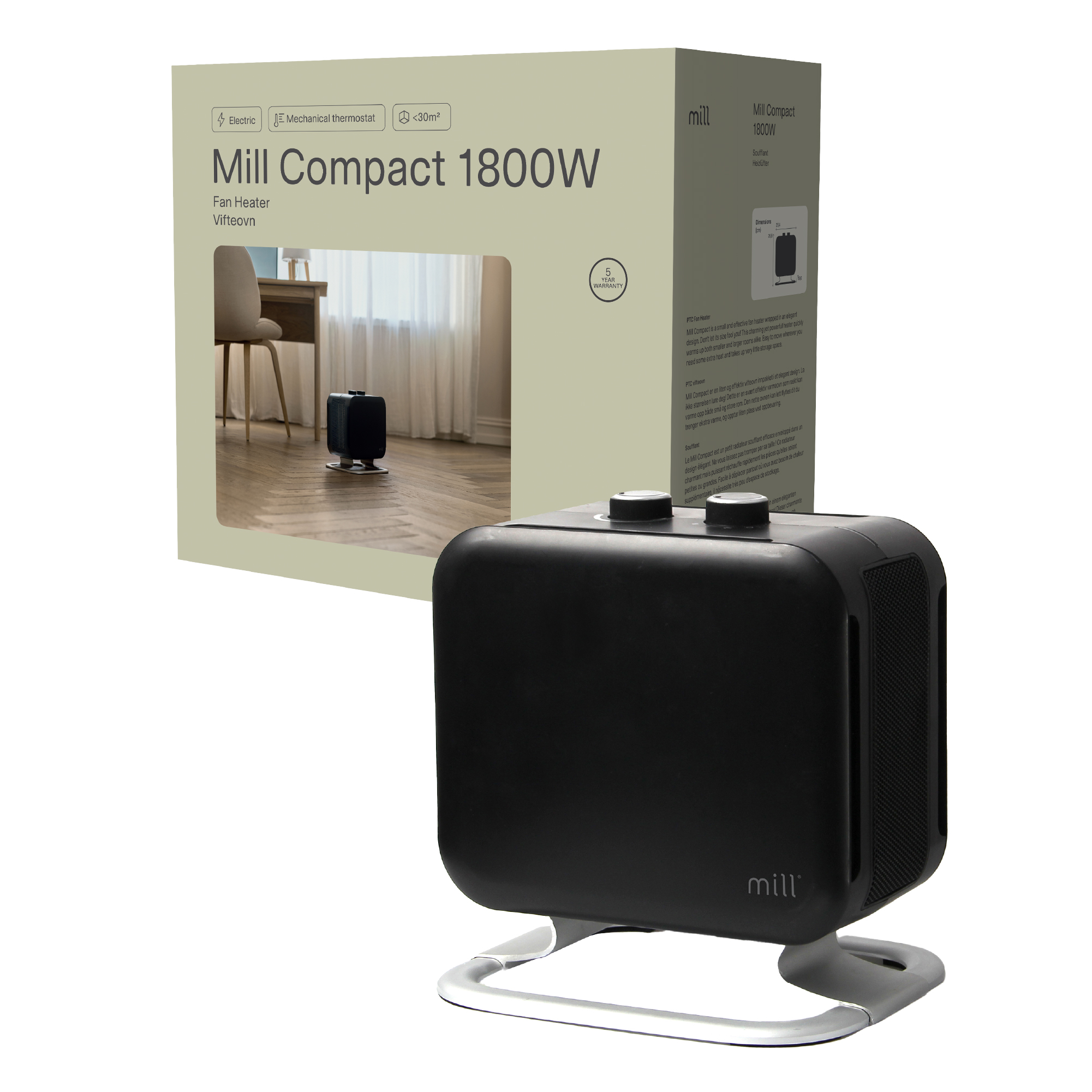 Mill Compact vifteovn – liten, kompakt og rask. Mill Compact er en liten og effektiv vifteovn innpakket i et elegant design. Ovnens avrundede kanter og lett buede sider understreker den skandinaviske stilen, og gjør at den passer godt inn i de aller fleste hjem. La ikke størrelsen lure deg! Dette er en svært effektiv varmeovn som raskt kan varme opp både små og store rom. Den nette ovnen kan lett flyttes dit du trenger ekstra varme, og opptar liten plass ved oppbevaring.