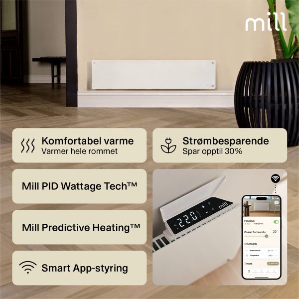 Mill WiFi panelovner er utstyrt med unik PID-teknologi som gir jevnere temperatur og redusert strømforbruk. Når ønsket temperatur er nådd vil ovnen opprettholde denne temperaturen ved å senke effektnivået som gir en mer stabil oppvarming med mindre temperatursvingninger enn tradisjonelle varmeovner.