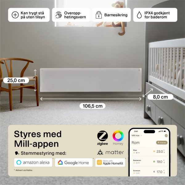 Mill WiFi generasjon 4 panelovner kommer nå med Matter-støtte, slik at du kan styre varmen i samme app som dine andre smarthjem-produkter, ønsker du det. Med Matter kan du nå enkelt regulere temperaturen med blant annet stemmestyring via Amazon Alexa, Apple Home og Google Home.