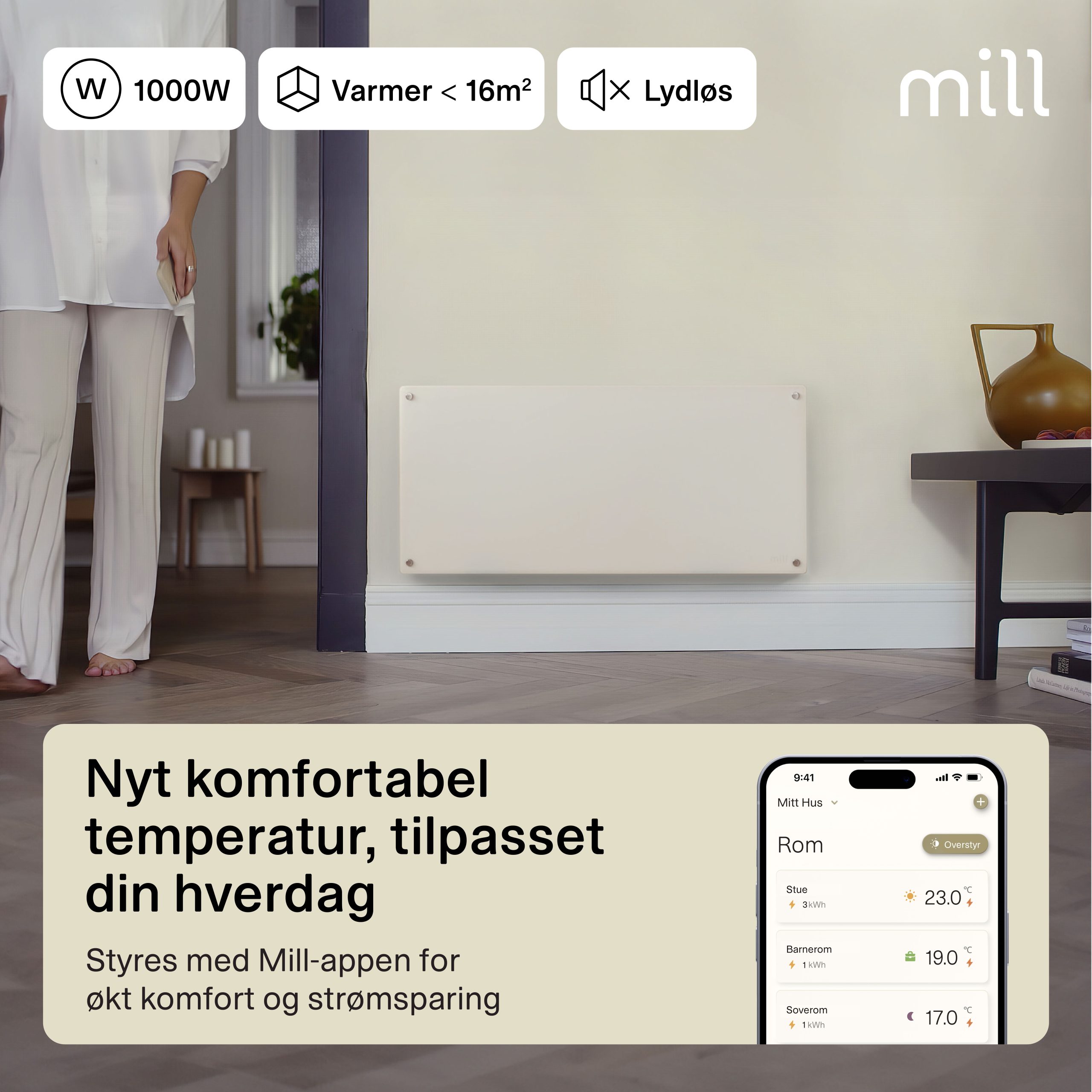 Mill WiFi panelovner er stille drift som vil si at det ikke er klikkelyd når temperaturen går opp og ned.