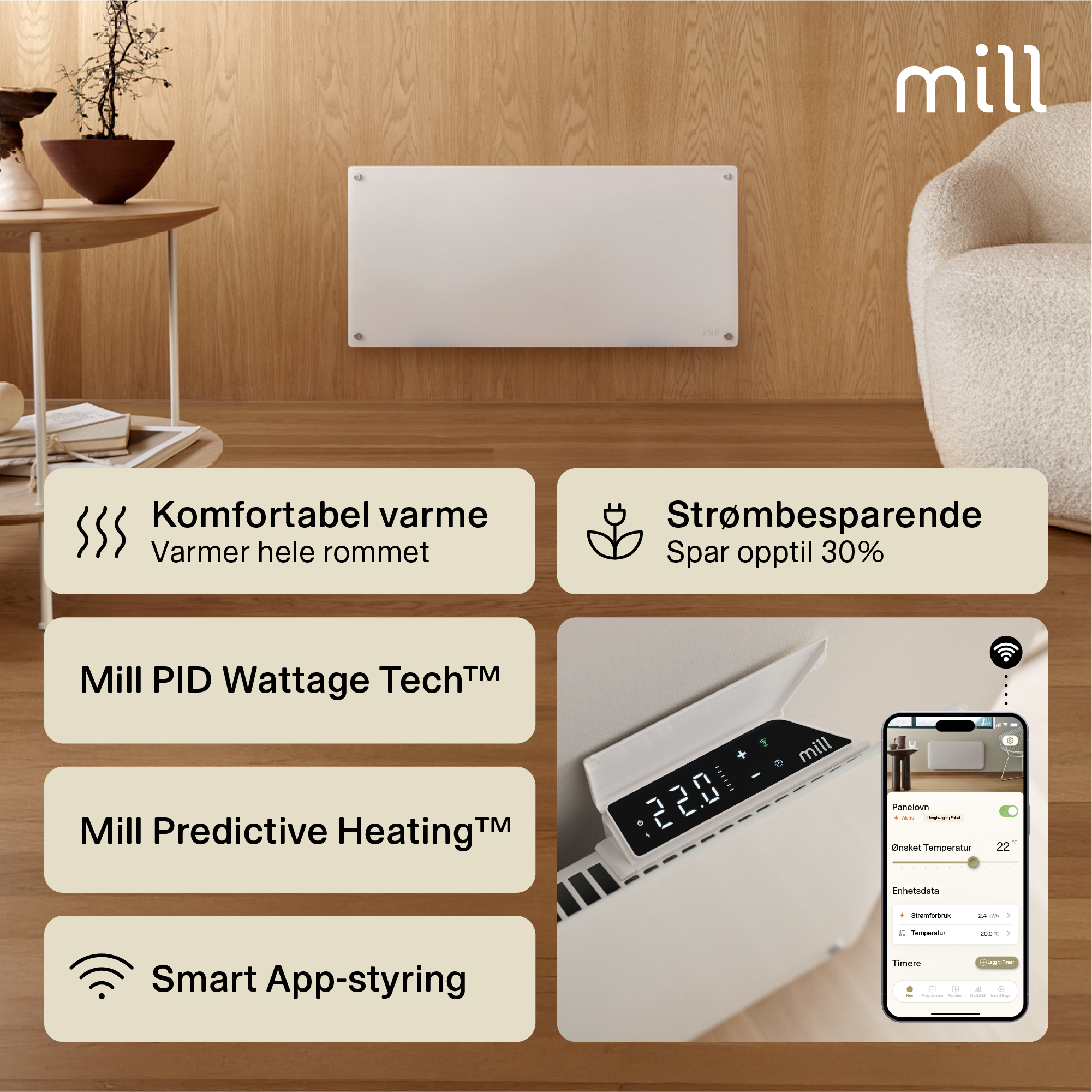 Mill WiFi panelovner er utstyrt med unik PID-teknologi som gir jevnere temperatur og redusert strømforbruk. Når ønsket temperatur er nådd vil ovnen opprettholde denne temperaturen ved å senke effektnivået som gir en mer stabil oppvarming med mindre temperatursvingninger enn tradisjonelle varmeovner.