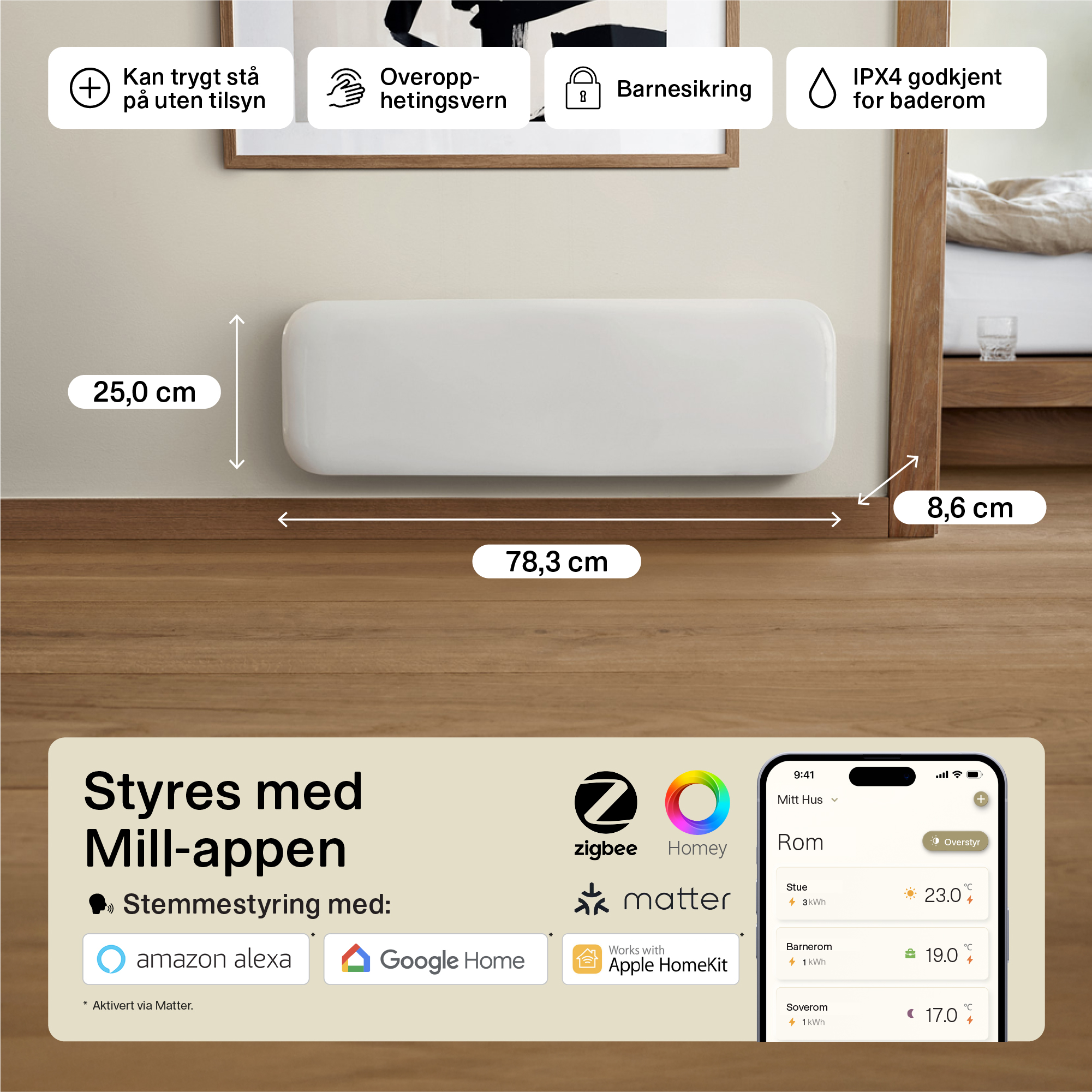 Mill WiFi generasjon 4 panelovner kommer nå med Matter-støtte, slik at du kan styre varmen i samme app som dine andre smarthjem-produkter, ønsker du det. Med Matter kan du nå enkelt regulere temperaturen med blant annet stemmestyring via Amazon Alexa, Apple Home og Google Home.