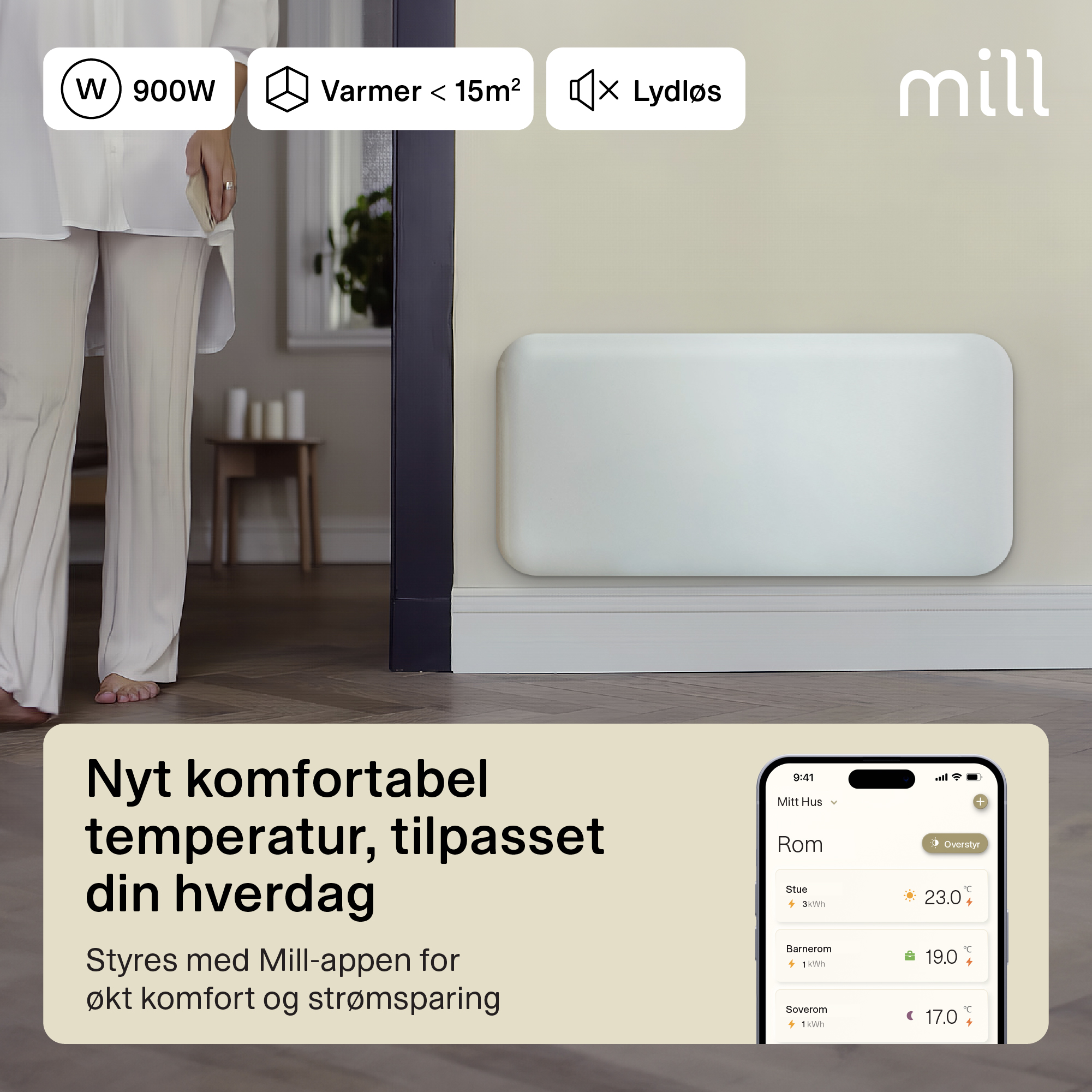 Mill WiFi panelovner er stille drift som vil si at det ikke er klikkelyd når temperaturen går opp og ned.