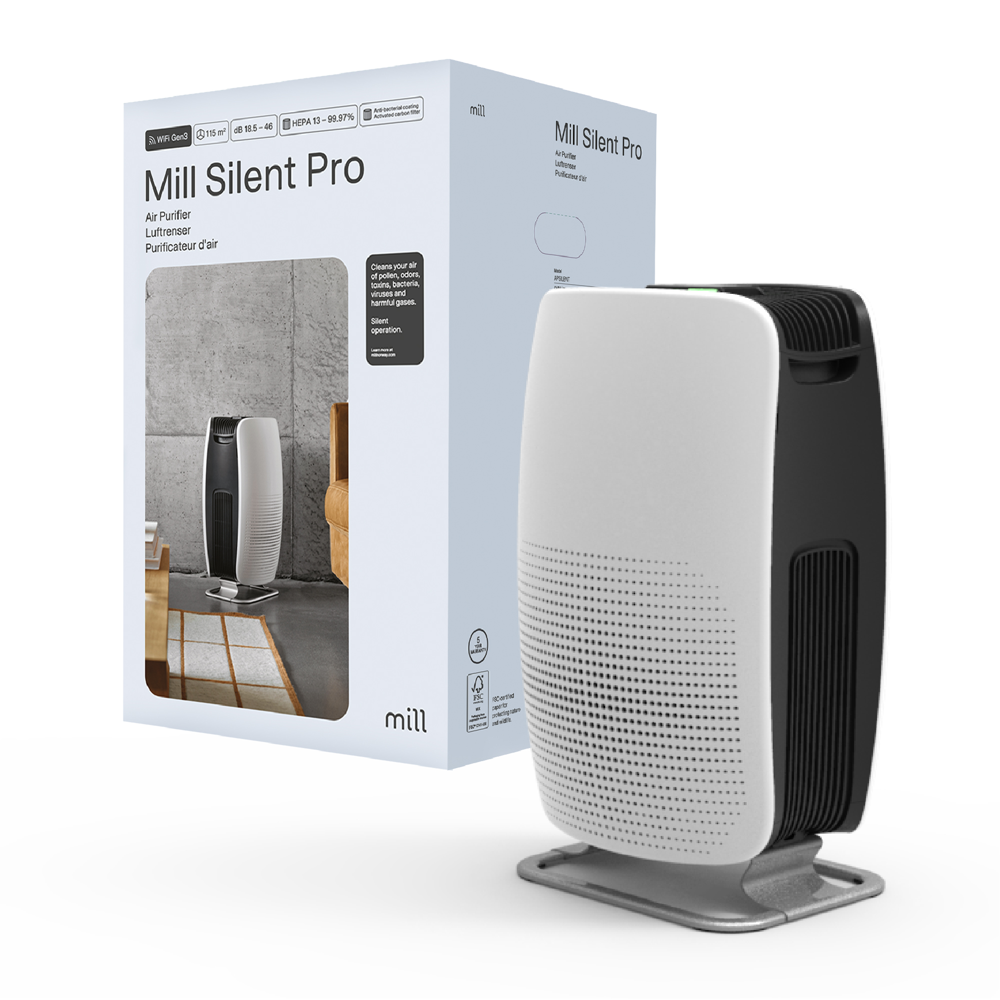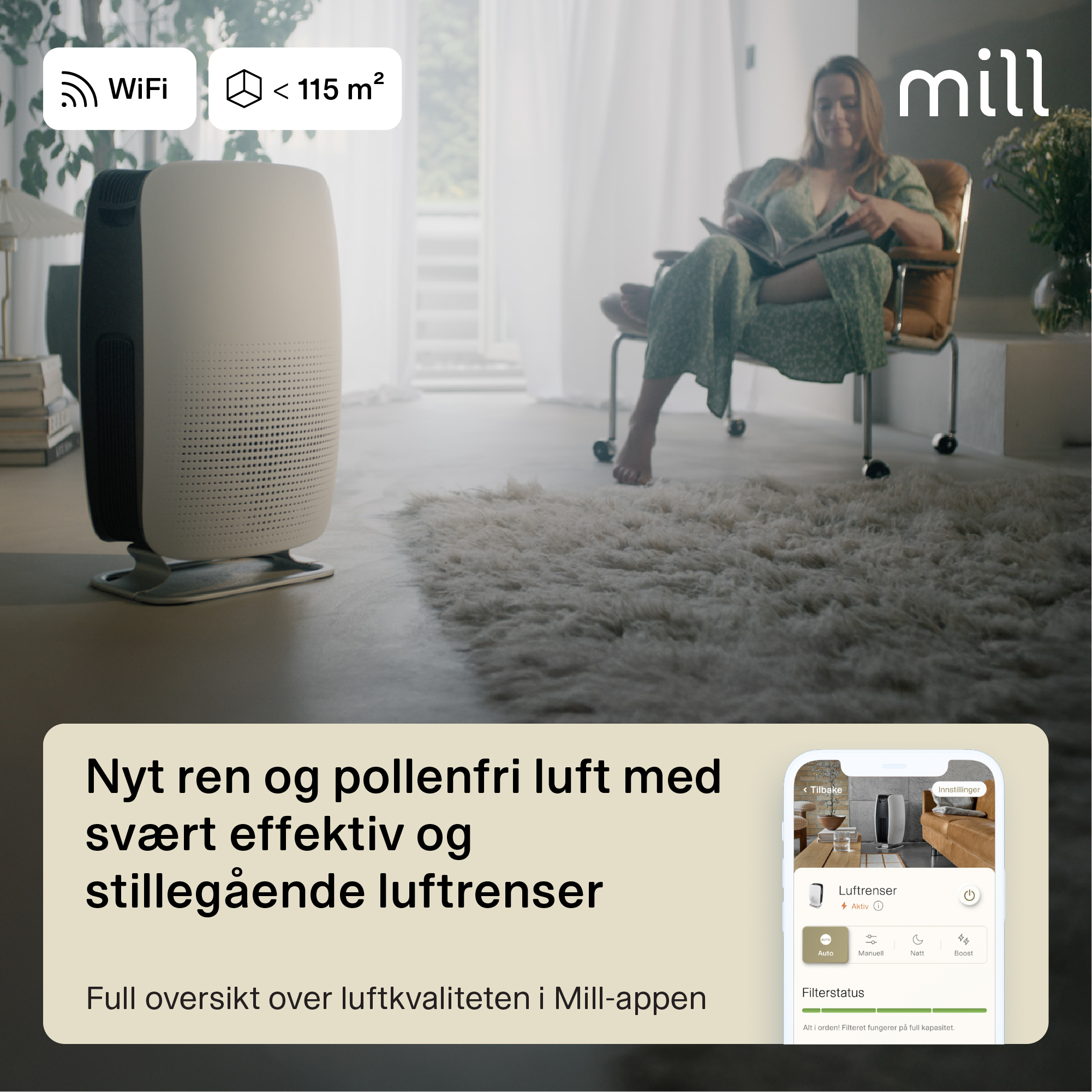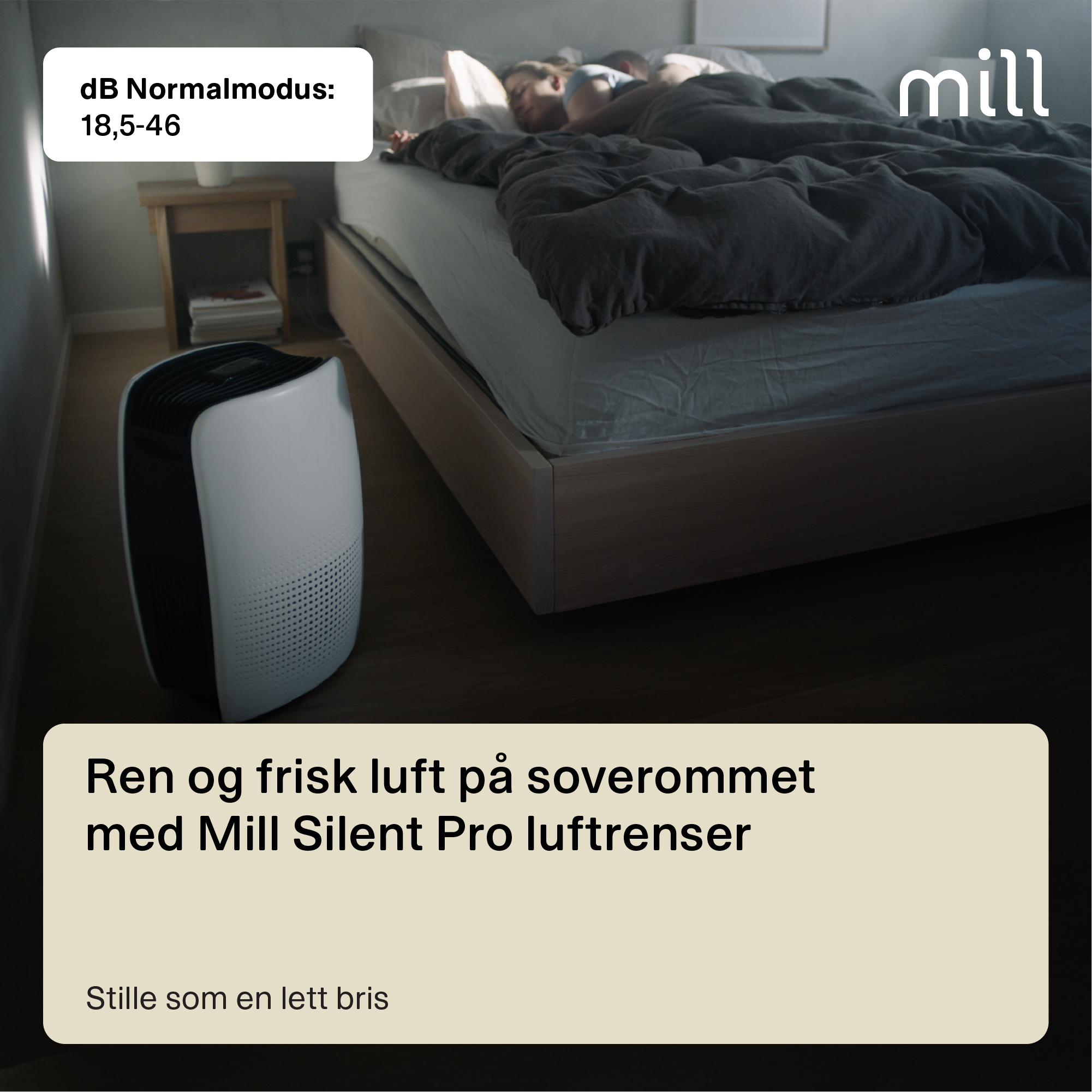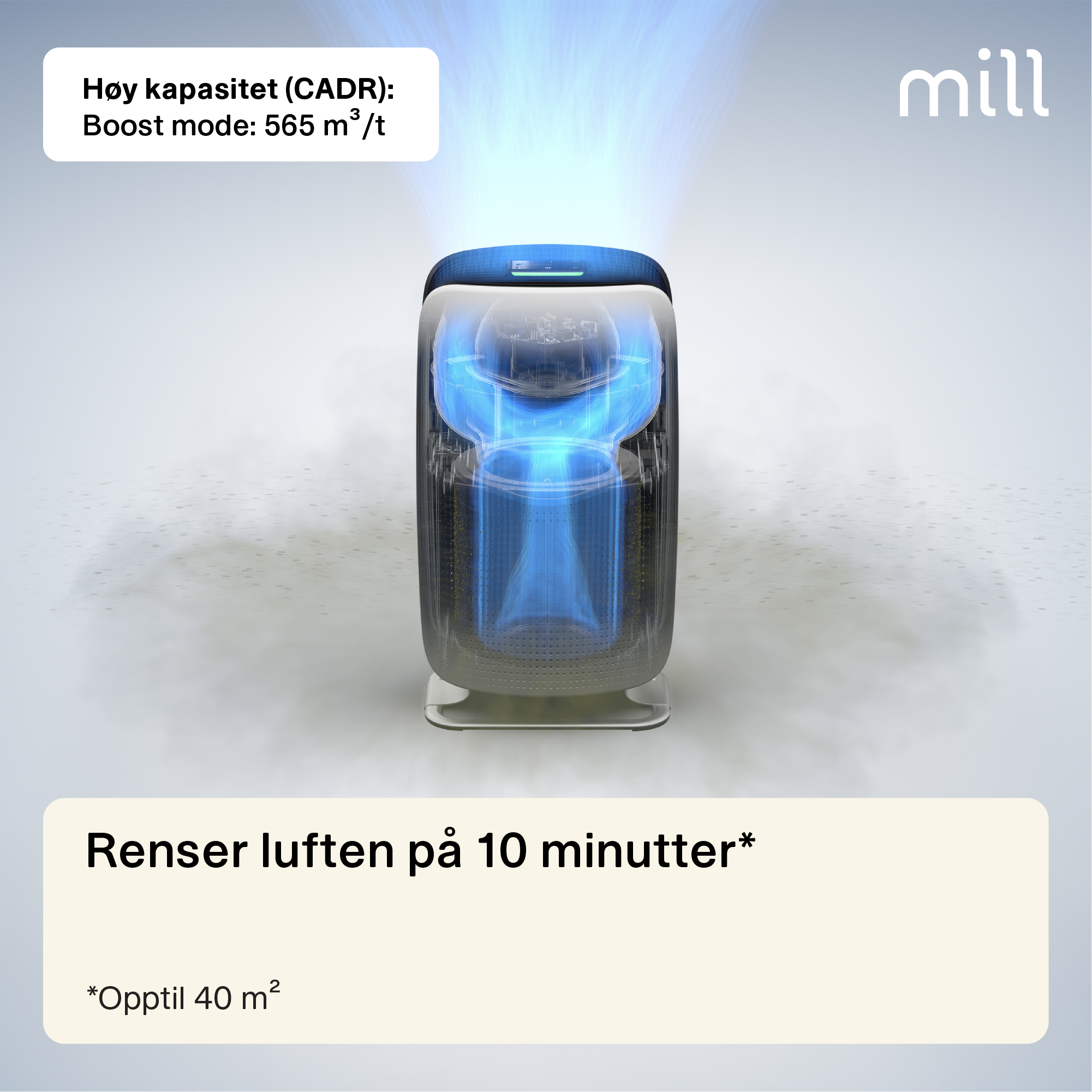 Mill Silent Pro renser luften din på mindre enn 10 minutter (romstørrelse <40 m2), og fjerner effektivt 99,97 % av alle skadelige partikler og gasser. Clean Air Delivery Rate (CADR) måler luftrenserens effektivitet basert volumet av luft som renses per minutt. Jo høyere tall, desto mer ren luft leverer luftrenseren.