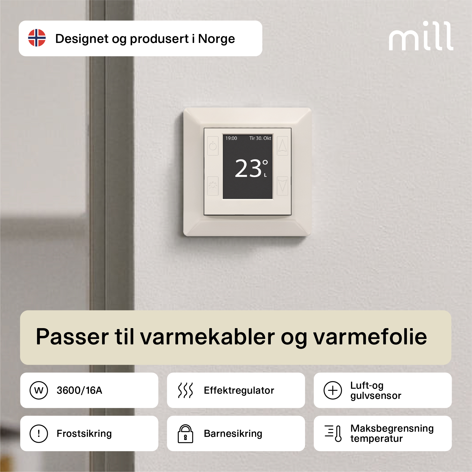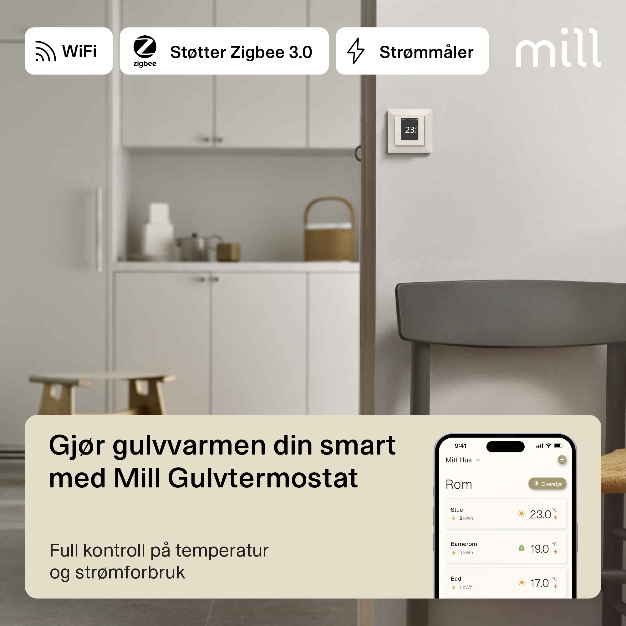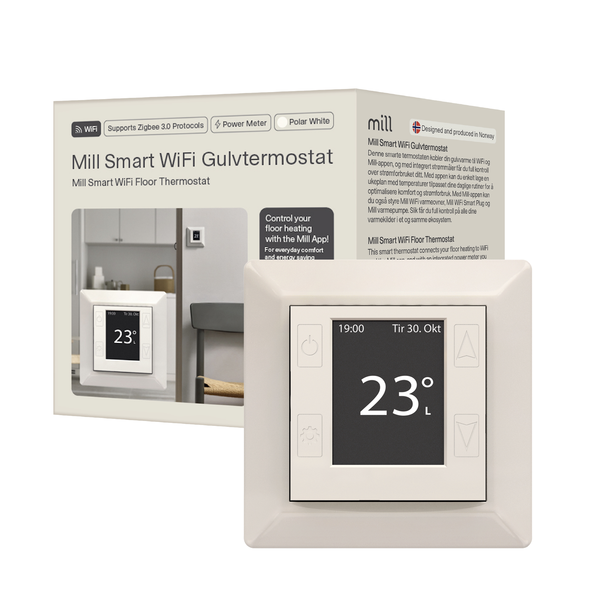 • WiFi + støtter Zigbee 3.0 Protocols + Mill App